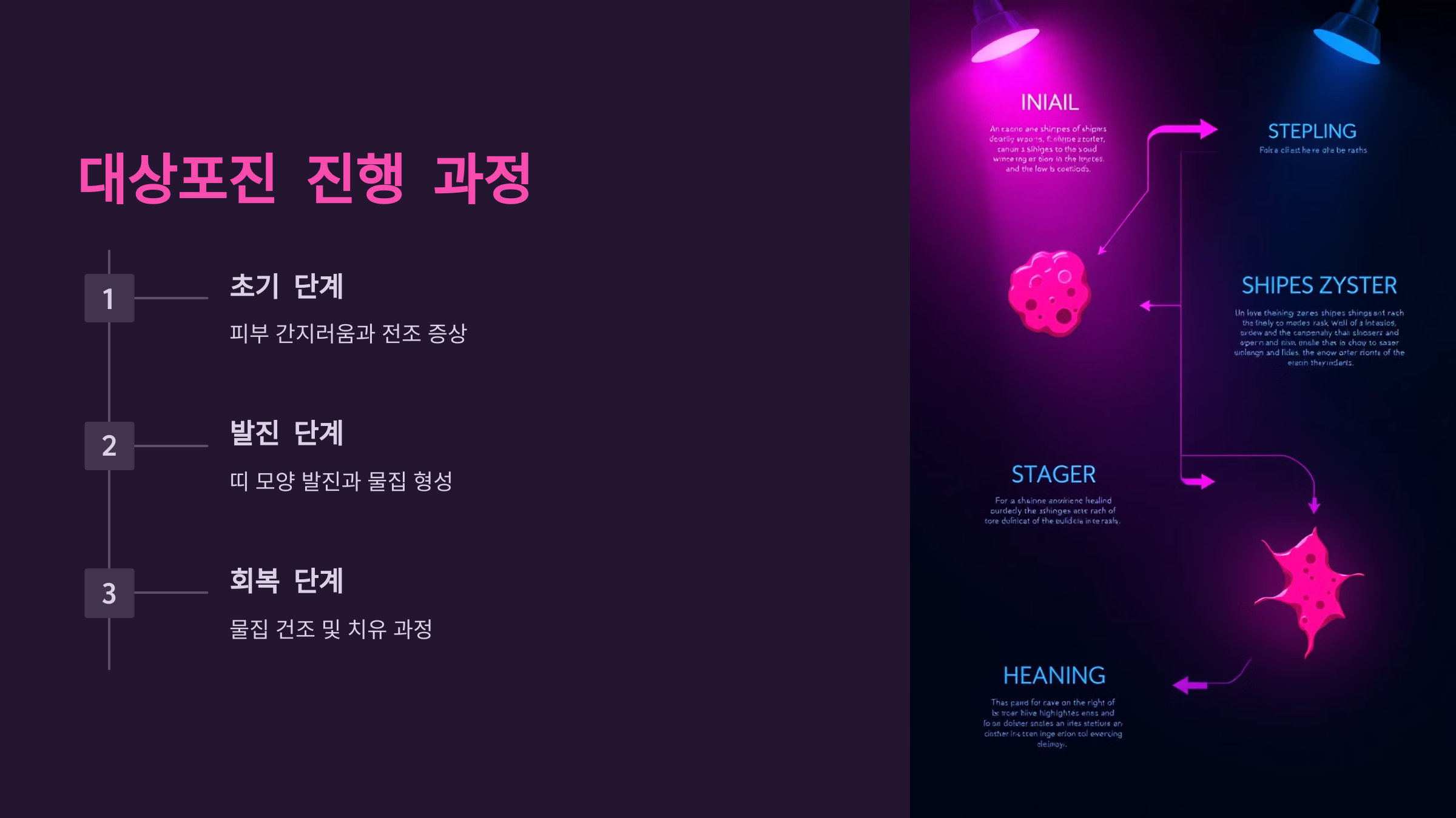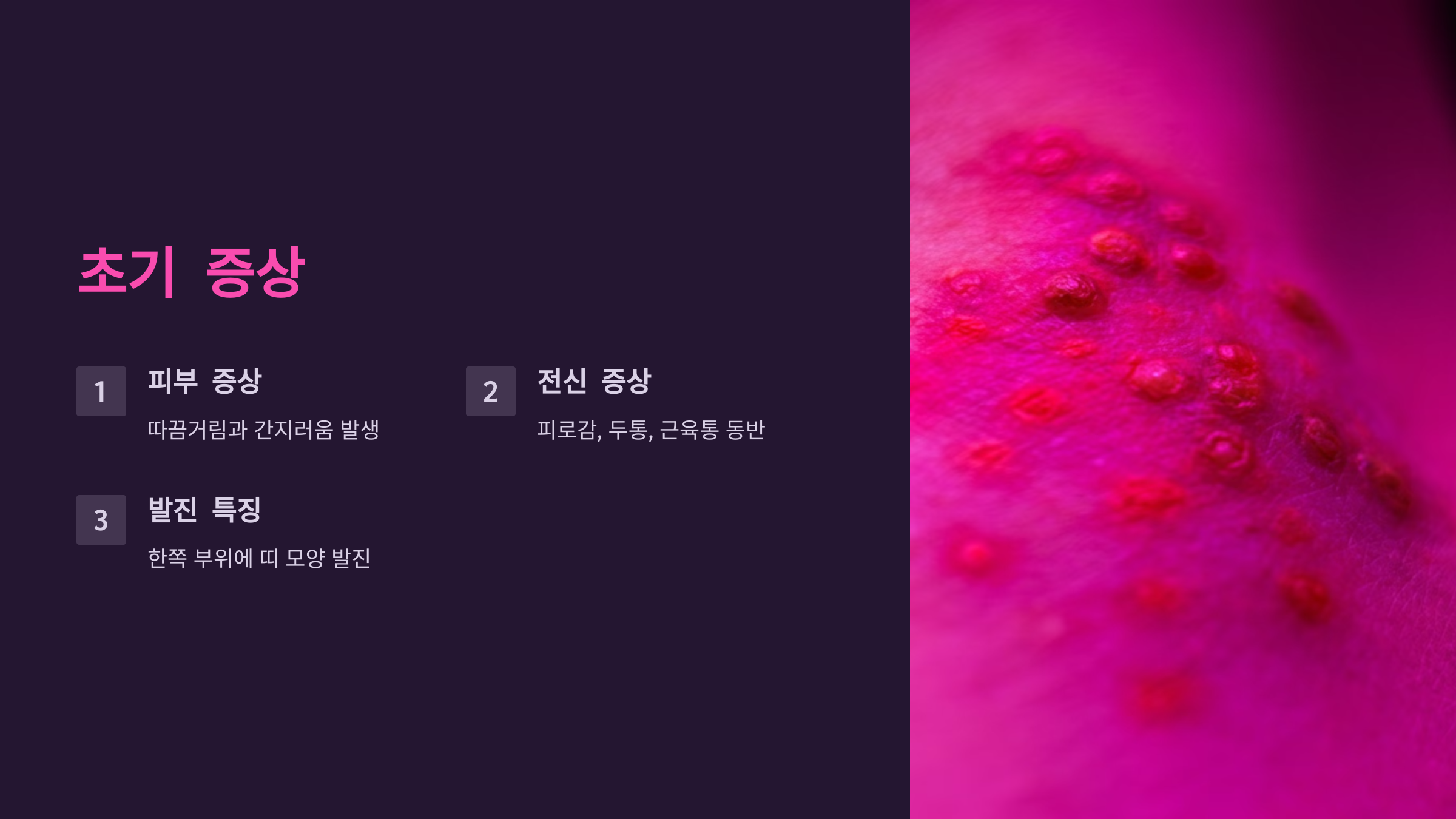 - 초기 증상 단계: 피부가 간지럽거나 따끔거리는 등의 전조 증상이 나타납니다.