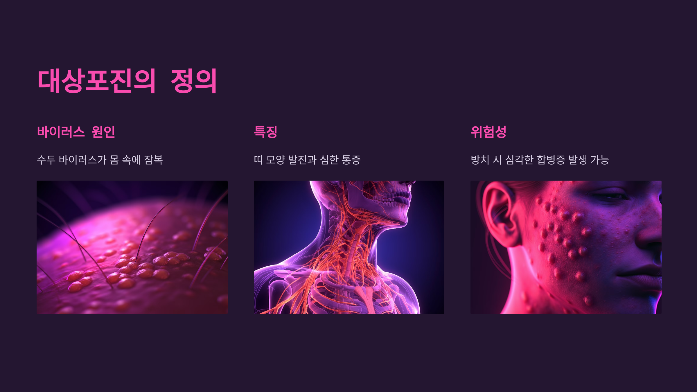 대상포진의 가장 큰 특징은 피부에 띠 모양의 발진과 물집이 생기며, 그 부위에 심한 통증이 동반된다는 점입니다. 대상포진을 방치하면 포진 후 신경통과 같은 합병증을 겪을 위험이 커지기 때문에 초기에 적절한 조치를 취하는 것이 중요합니다.
