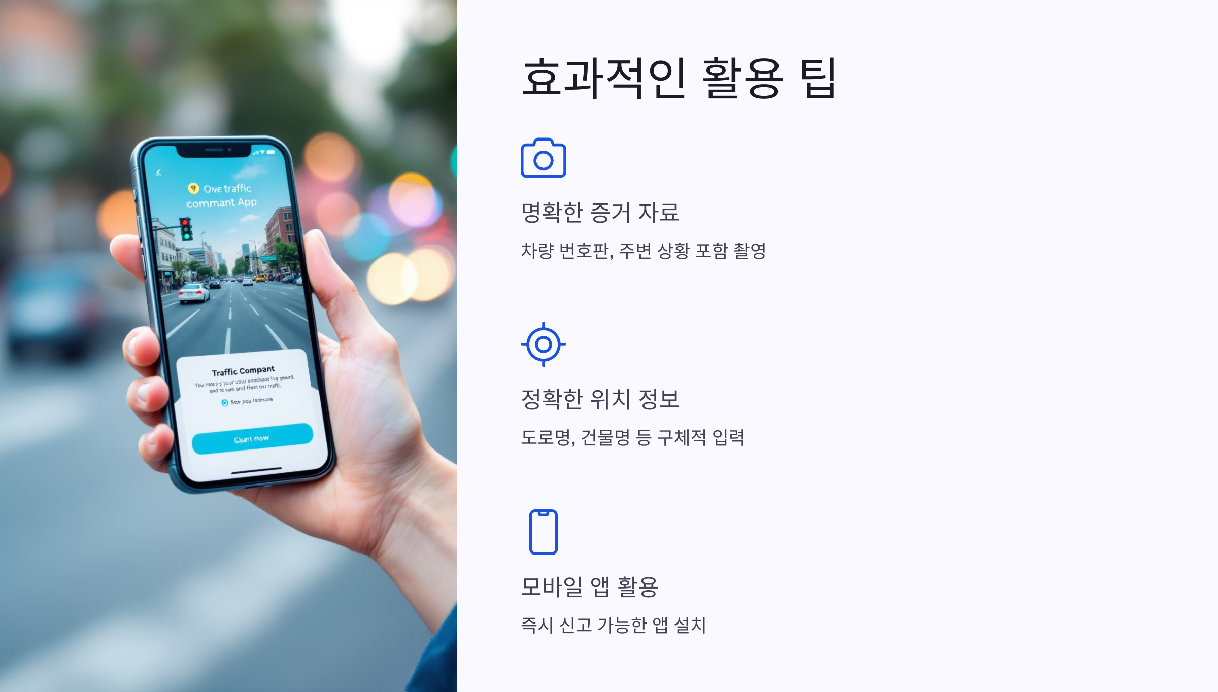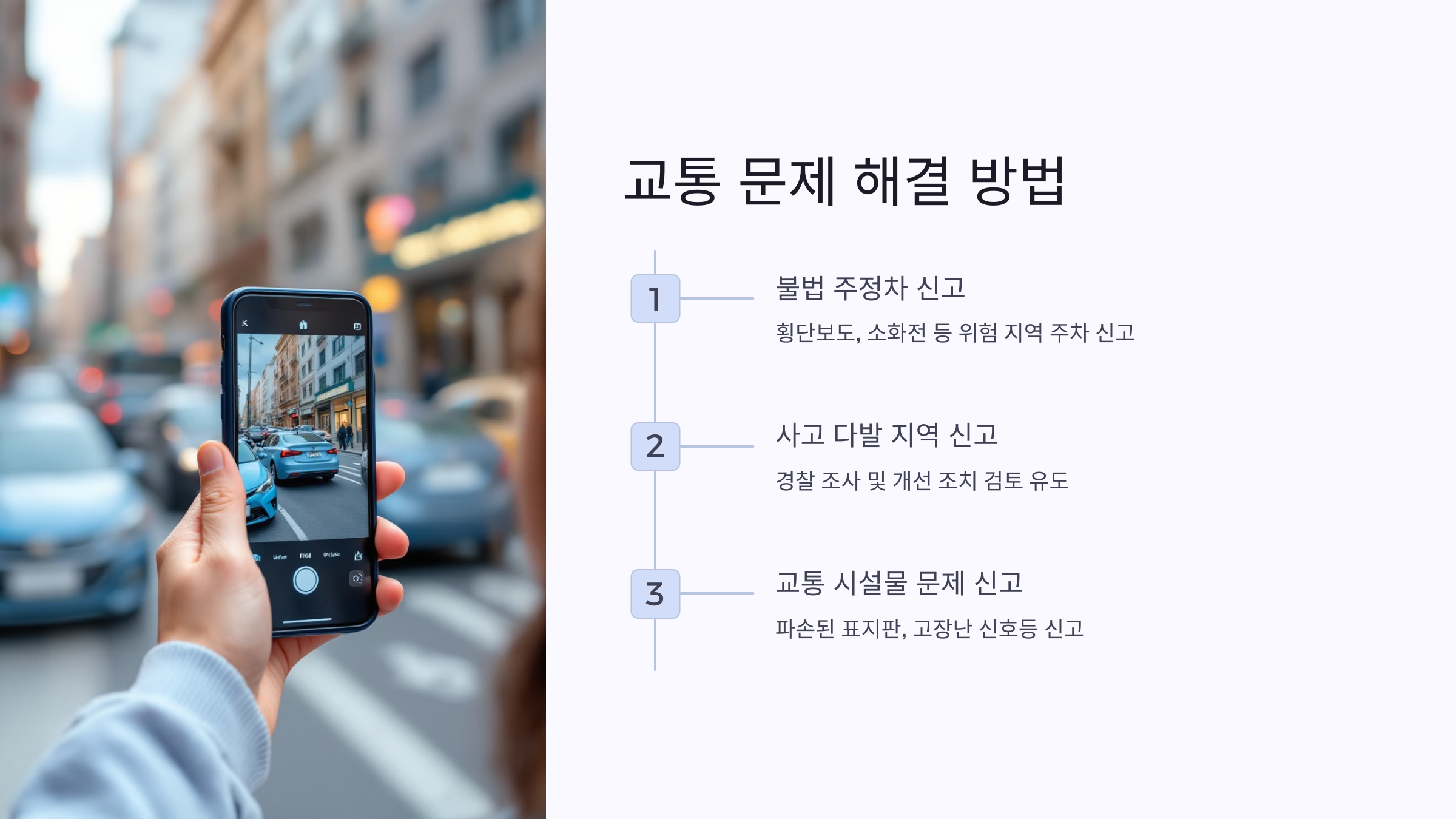 불법 주정차나 신호 위반과 같은 교통 법규 위반은 신고자가 명확한 증거 자료를 제공할 때 더 신속하게 처리됩니다. 사진을 찍을 때는 주변 상황이 함께 나오도록 촬영하고, 차량 번호판이나 신호 상태가 명확히 드러나도록 하는 것이 중요합니다.
