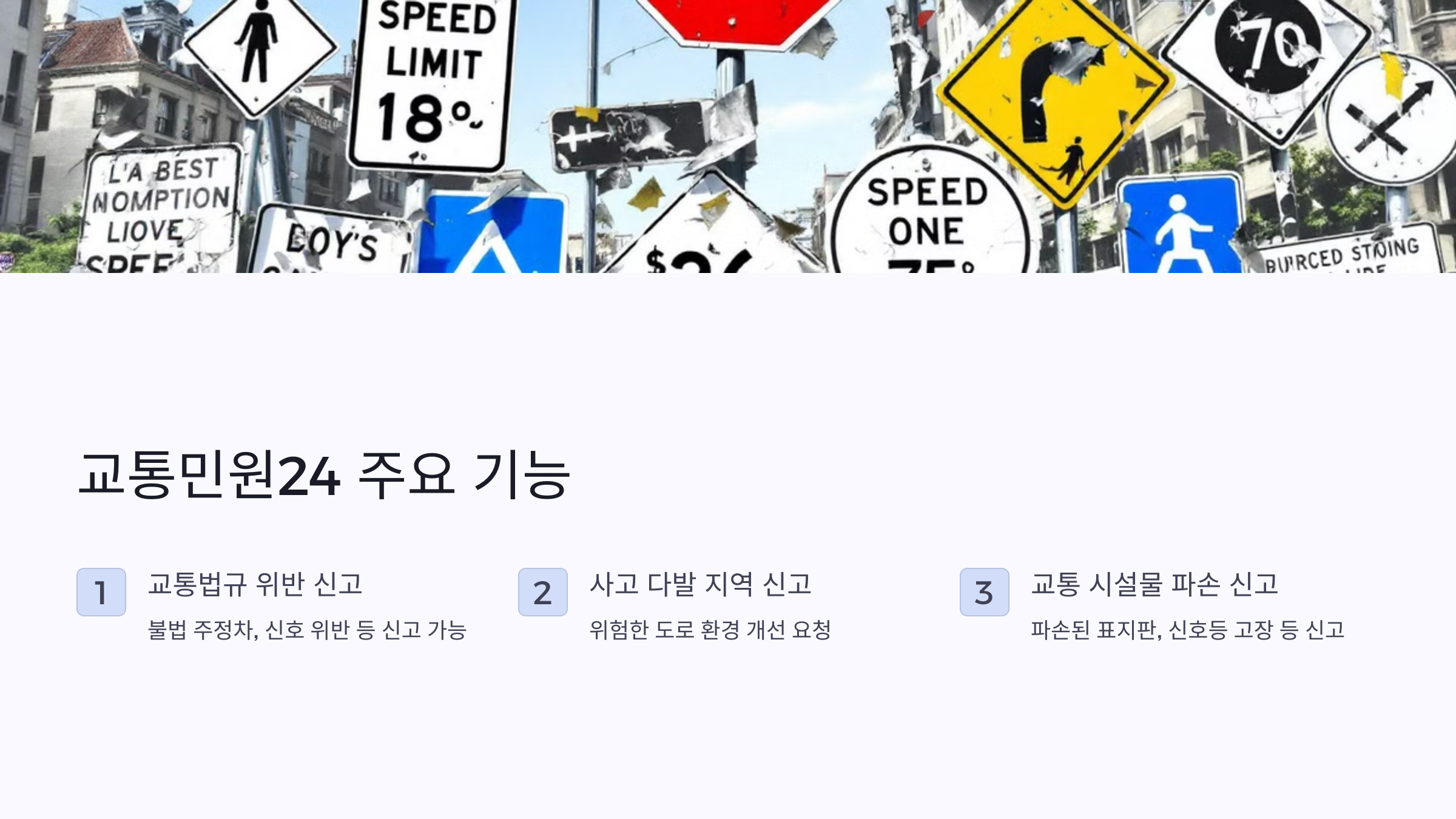 - 교통 시설물 파손 신고: 파손된 교통 표지판, 신호등 고장, 노면 상태 불량 등 교통 시설물 관련 민원을 제기할 수 있습니다.
