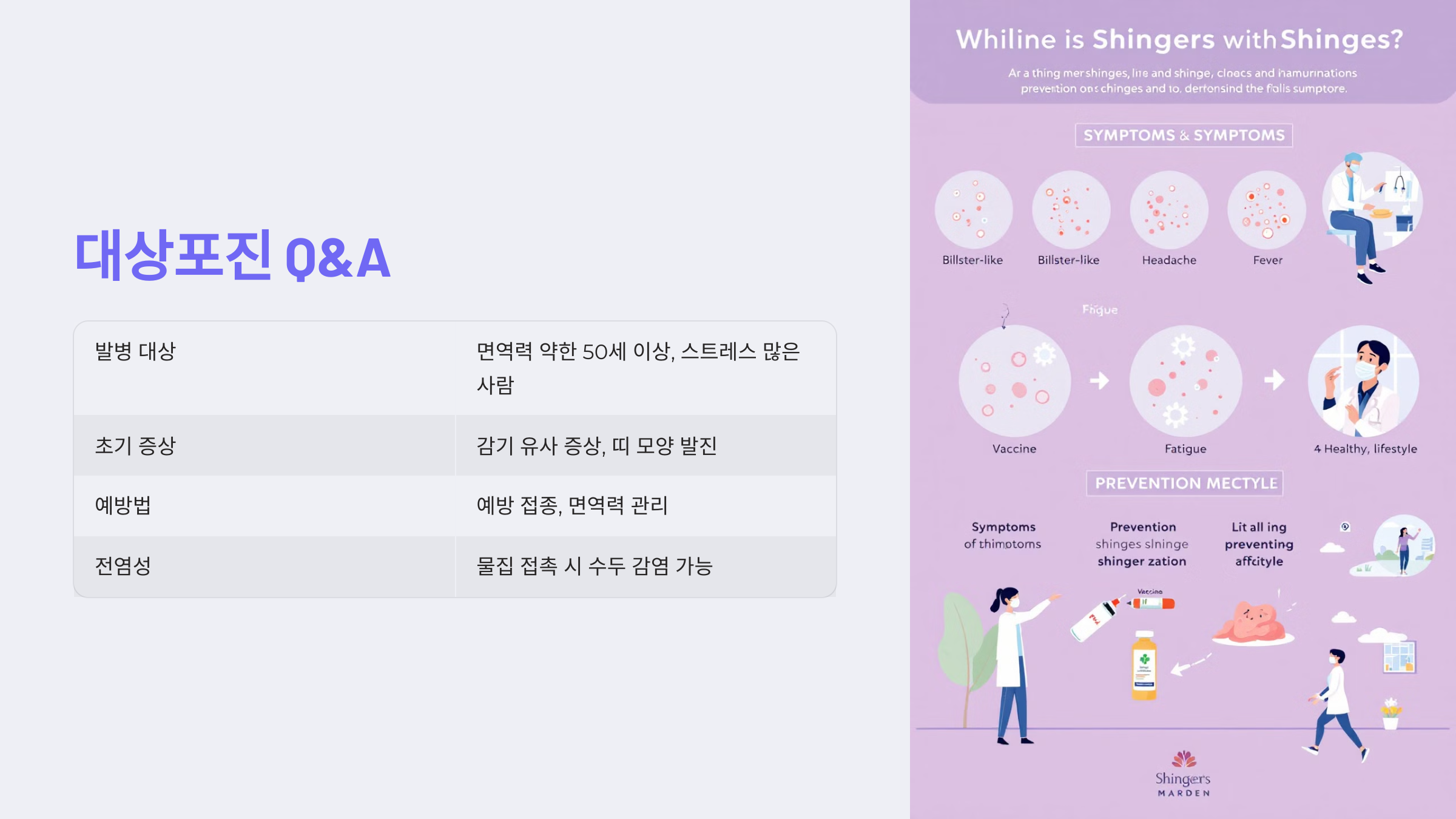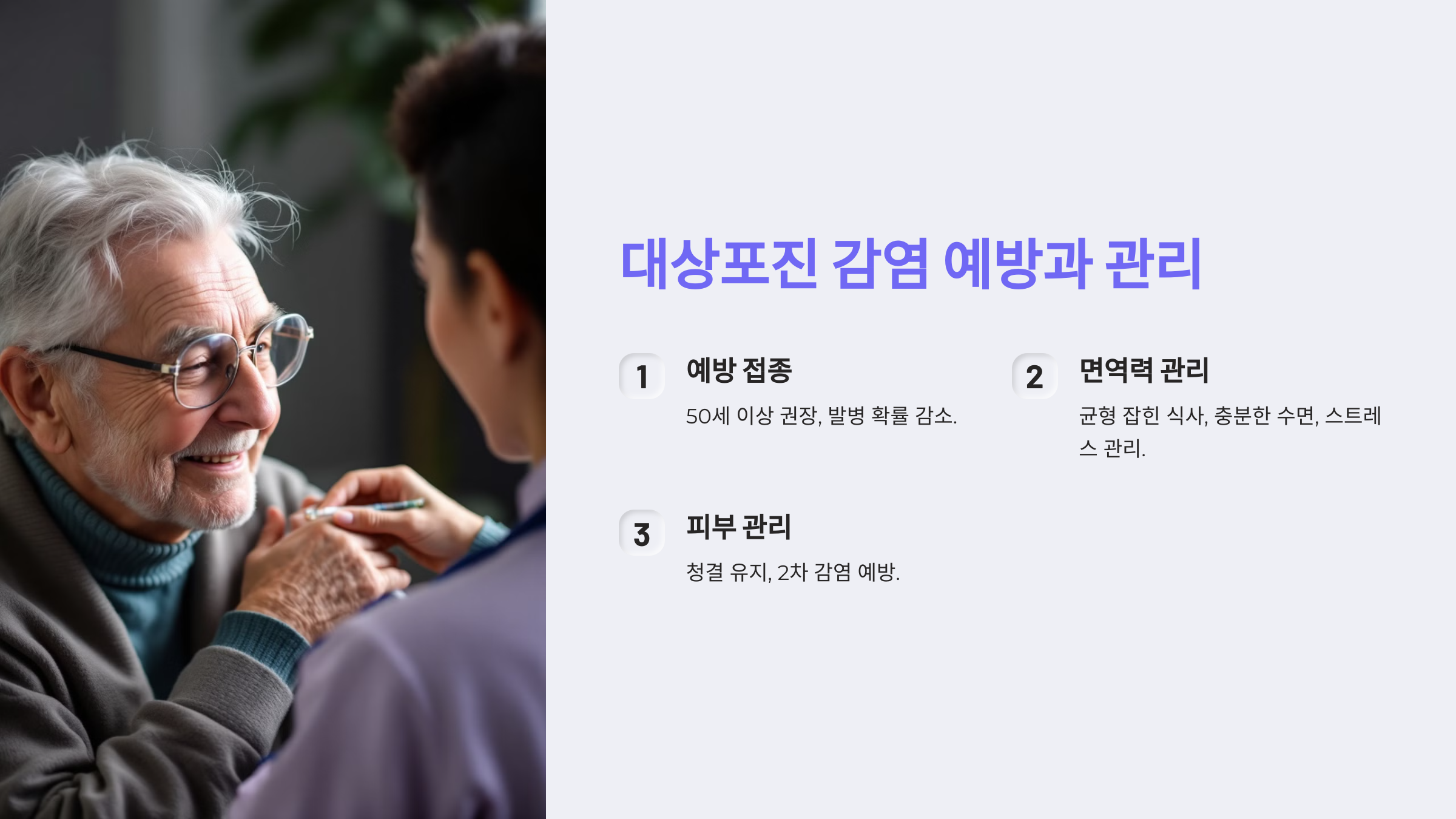 A3: 대상포진 예방 접종이 가장 효과적입니다. 또한, 규칙적인 운동과 균형 잡힌 식사, 충분한 수면으로 면역력을 관리하고, 스트레스를 줄이는 것이 중요합니다.