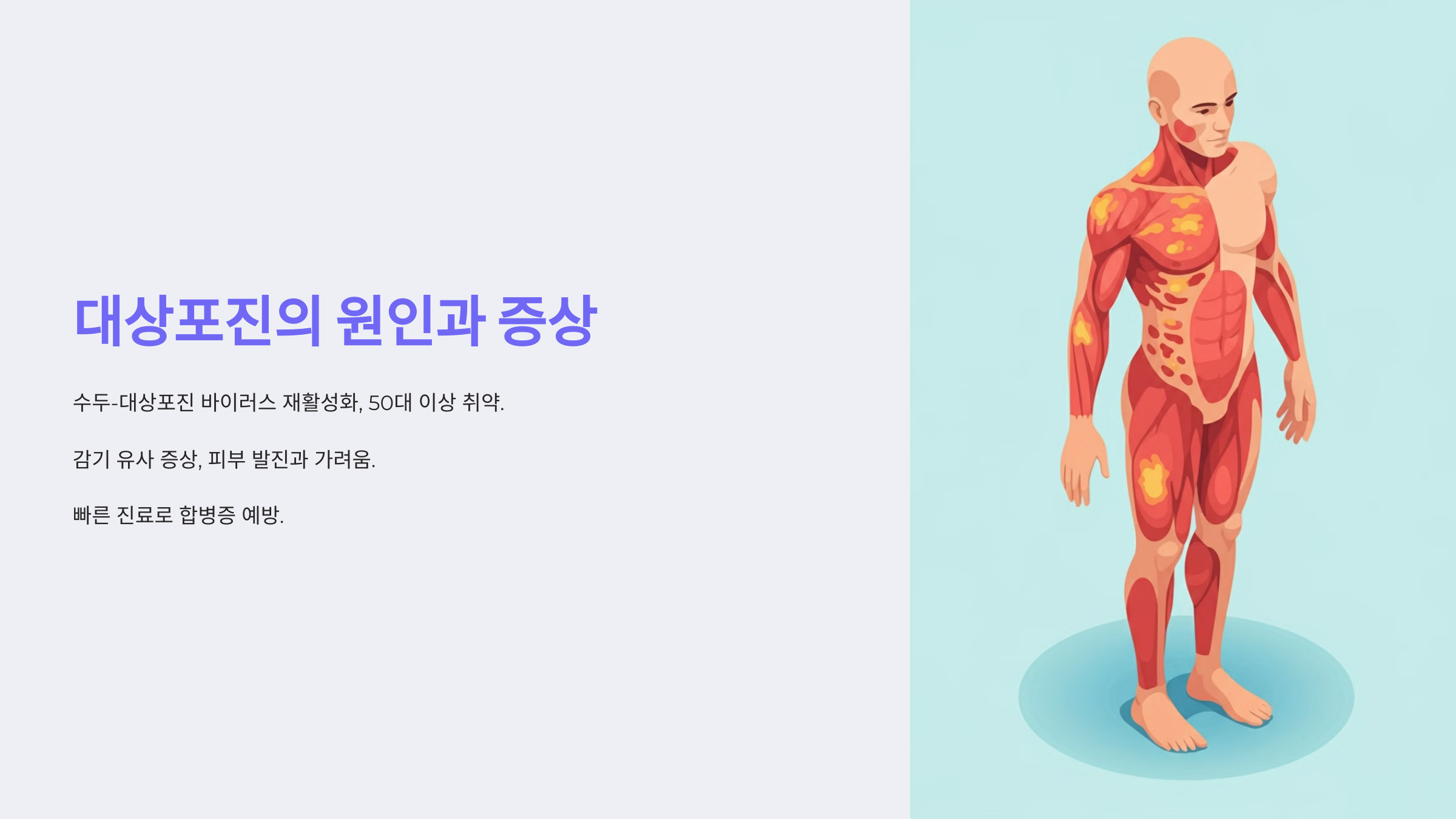이 질병은 면역력이 약해지면서 잠복해 있던 바이러스가 활성화되면서 발생하는데, 초기 증상이 감기나 근육통과 비슷해 쉽게 지나칠 수 있습니다.