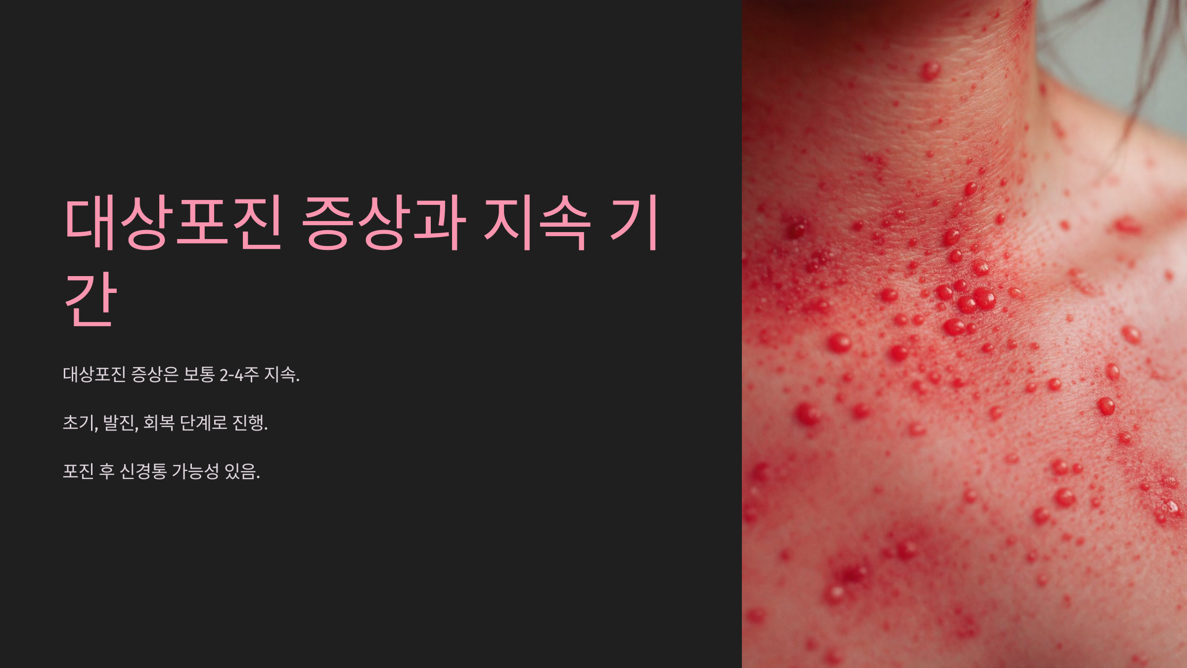 대상포진의 증상은 보통 2주에서 4주 동안 진행되며, 병의 진행 과정은 다음과 같습니다.