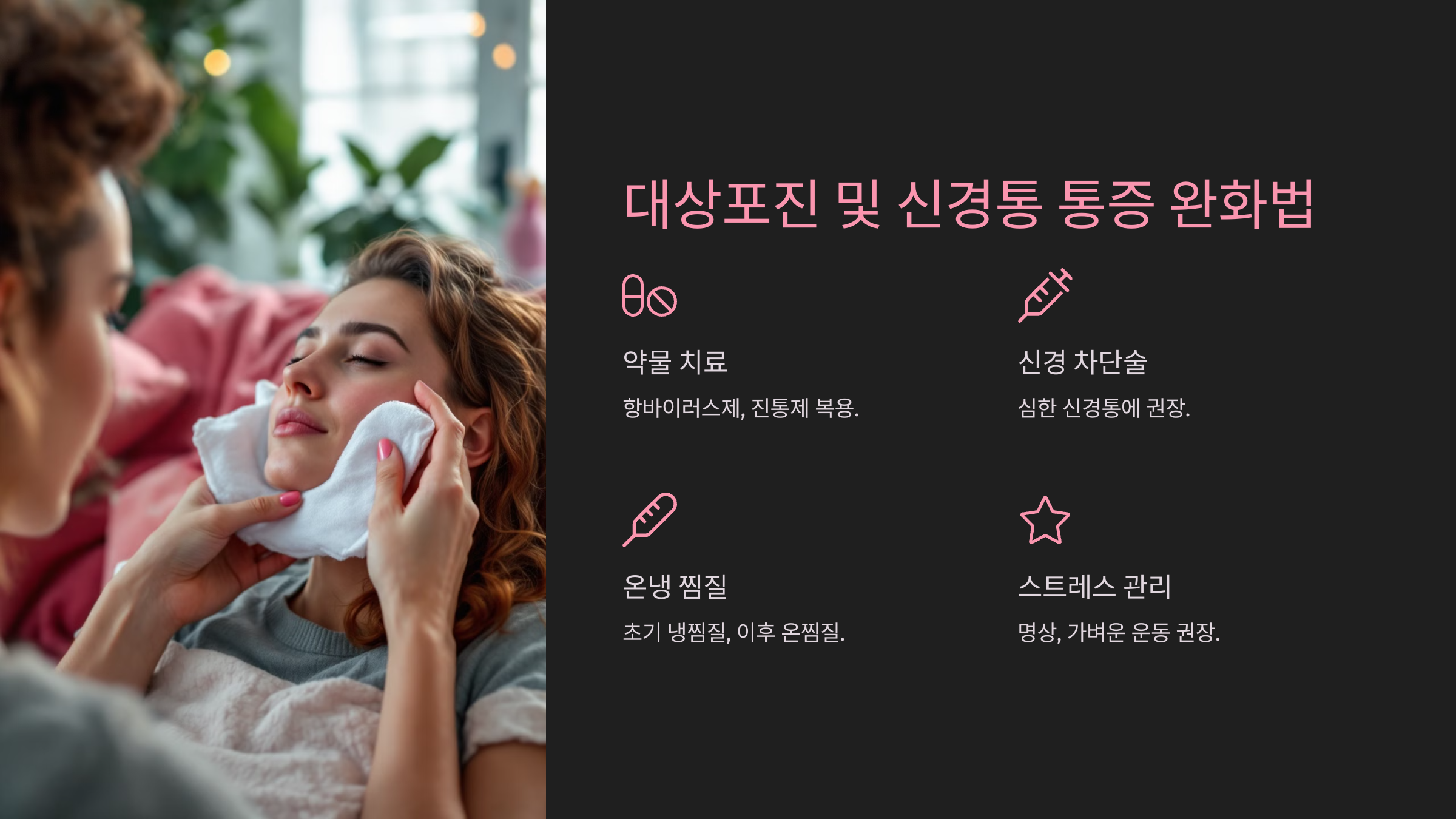 대상포진의 통증은 상당히 심할 수 있기 때문에, 고통을 줄이기 위한 다양한 방법을 알아두는 것이 좋습니다.