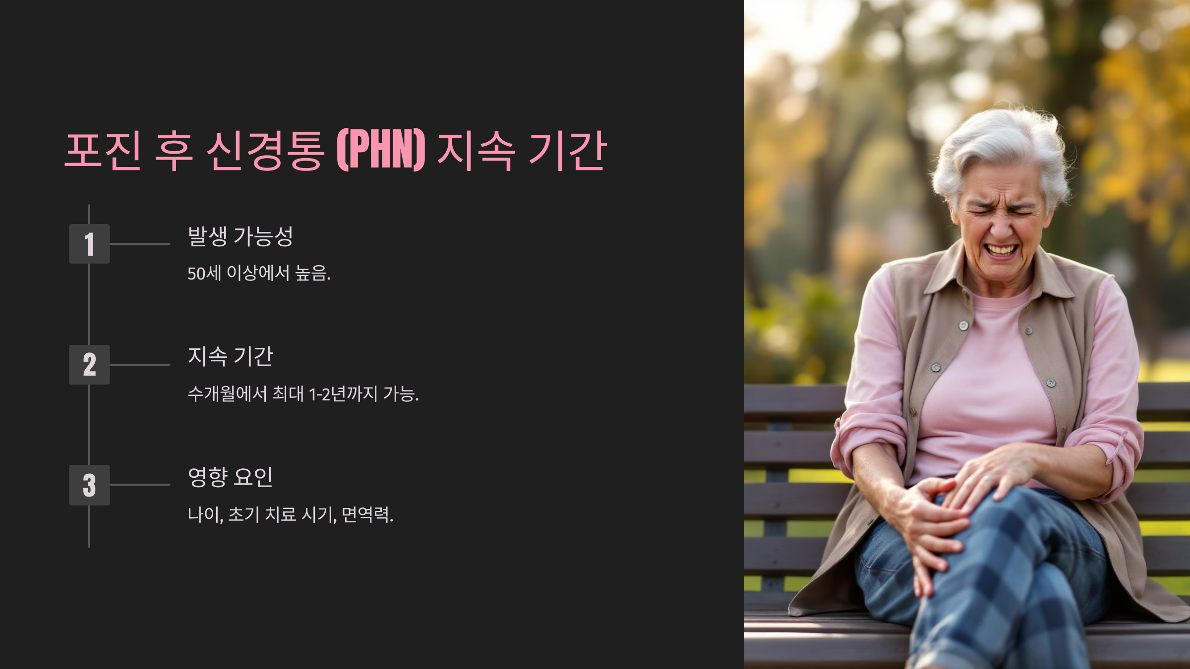 포진 후 신경통(PHN)은 대상포진이 치유된 후에도 신경 손상으로 인해 지속되는 통증으로, 일부 환자에게는 대상포진 발병 후 수개월, 때로는 수년간 이어질 수 있습니다. 특히 50세 이상에서는 포진 후 신경통이 발생할 가능성이 높습니다.