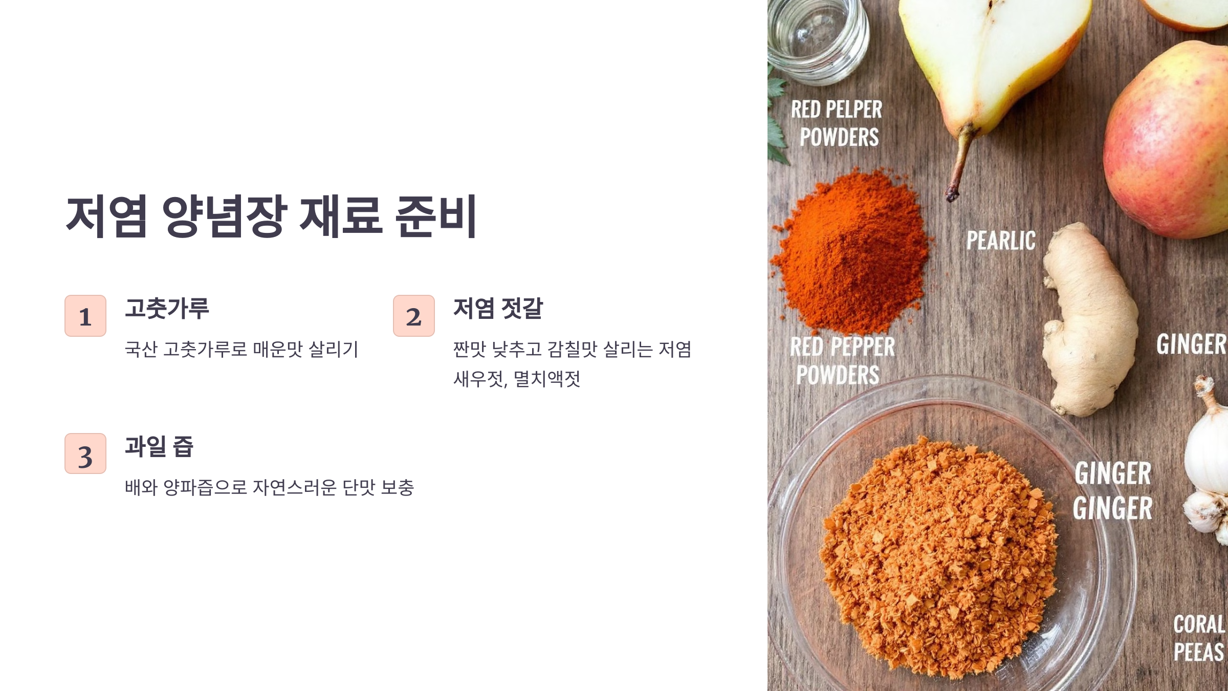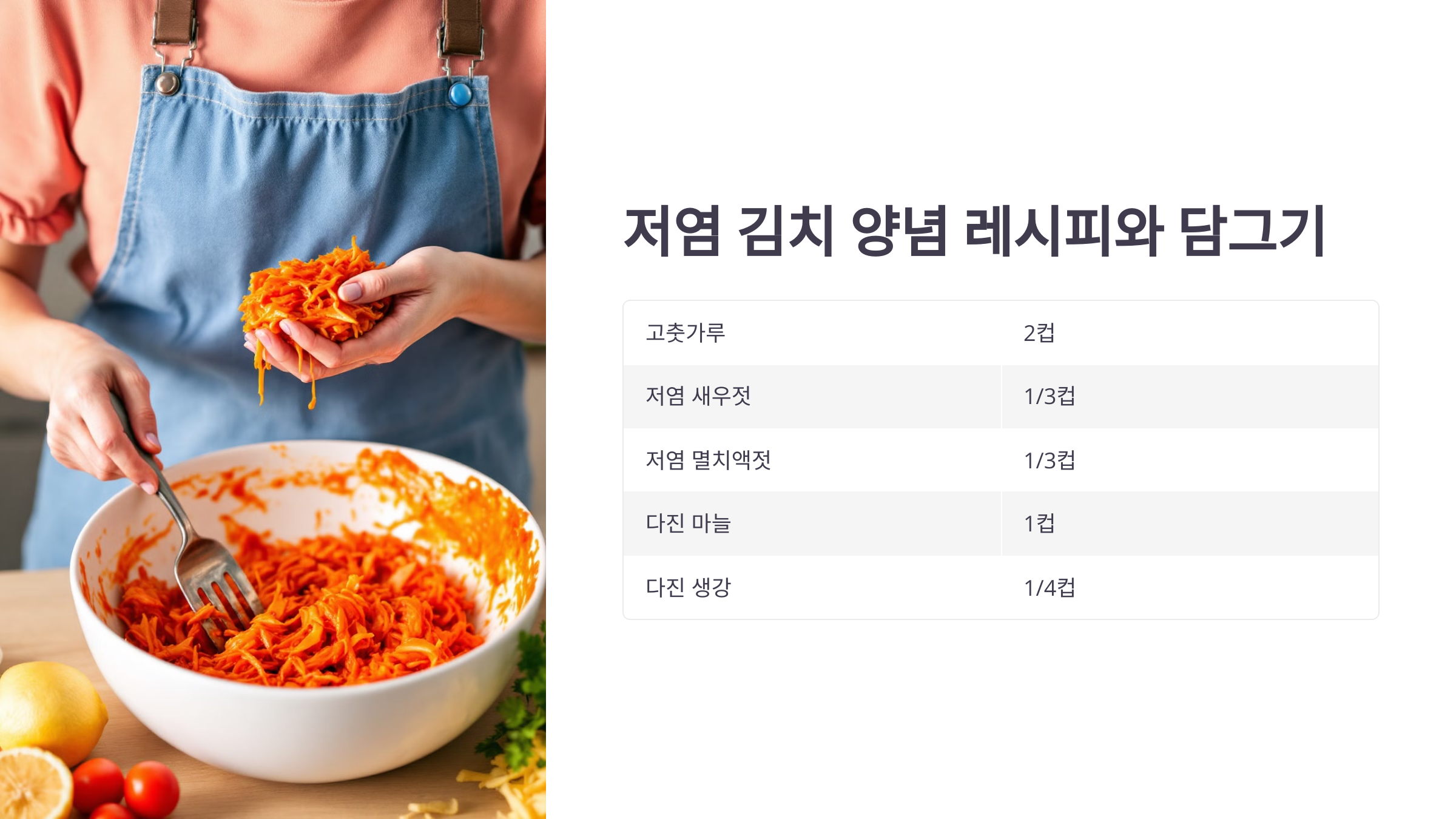 - 저염 새우젓과 멸치액젓: 소금 함량이 낮은 젓갈을 선택하여 김치의 감칠맛을 살리되, 짠맛은 낮추어 줍니다.