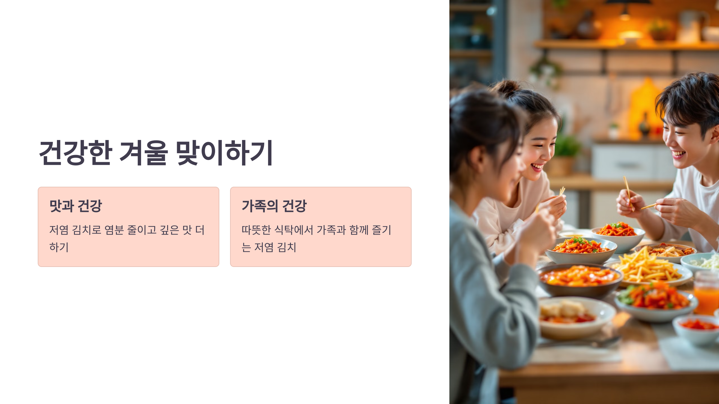 저염 김치로 염분은 줄이고 깊은 맛을 더해 건강한 겨울을 준비해 보세요. 맛과 건강을 모두 잡는 저염 김치로 가족과 함께 따뜻한 식탁을 채워보세요!