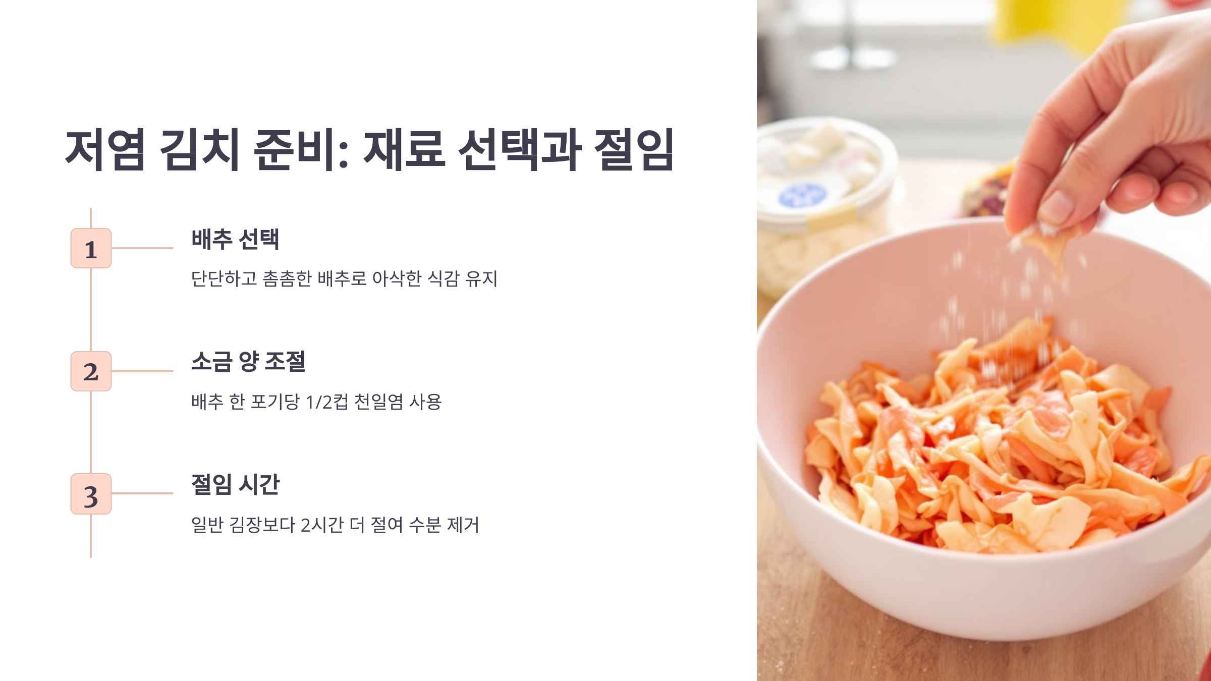 - 소금 양 조절: 절임 과정에서 사용하는 소금의 양을 줄이되, 절임 시간을 조금 늘려 배추가 적당히 절여지도록 합니다.