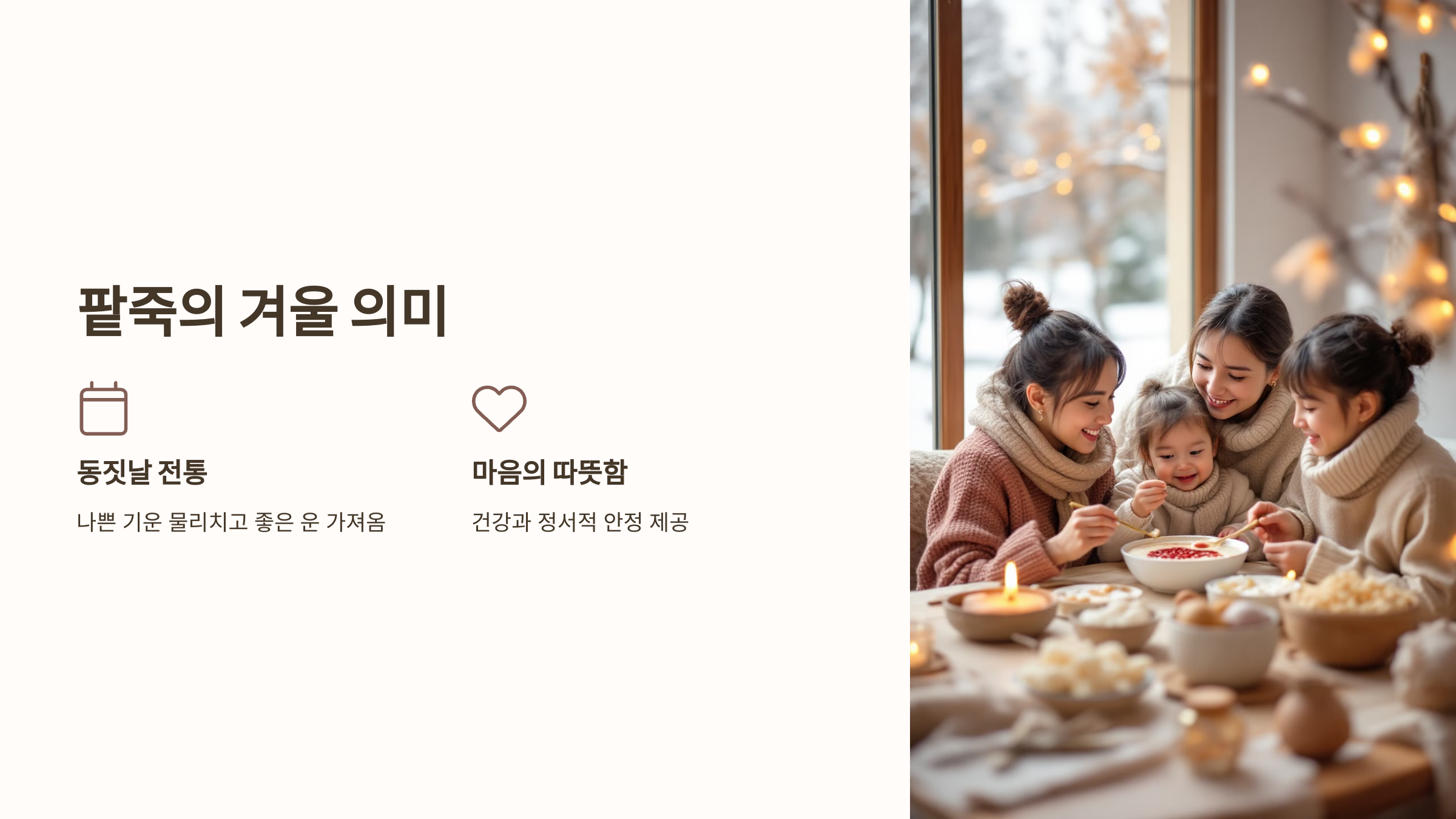 팥죽은 단순히 음식 그 이상의 가치를 지닙니다. 동짓날 팥죽을 먹는 전통은 팥이 나쁜 기운을 물리치고 좋은 운을 가져다준다는 믿음에서 시작되었습니다. 팥죽 한 그릇으로 건강을 챙기고 마음의 따뜻함까지 느껴보세요.