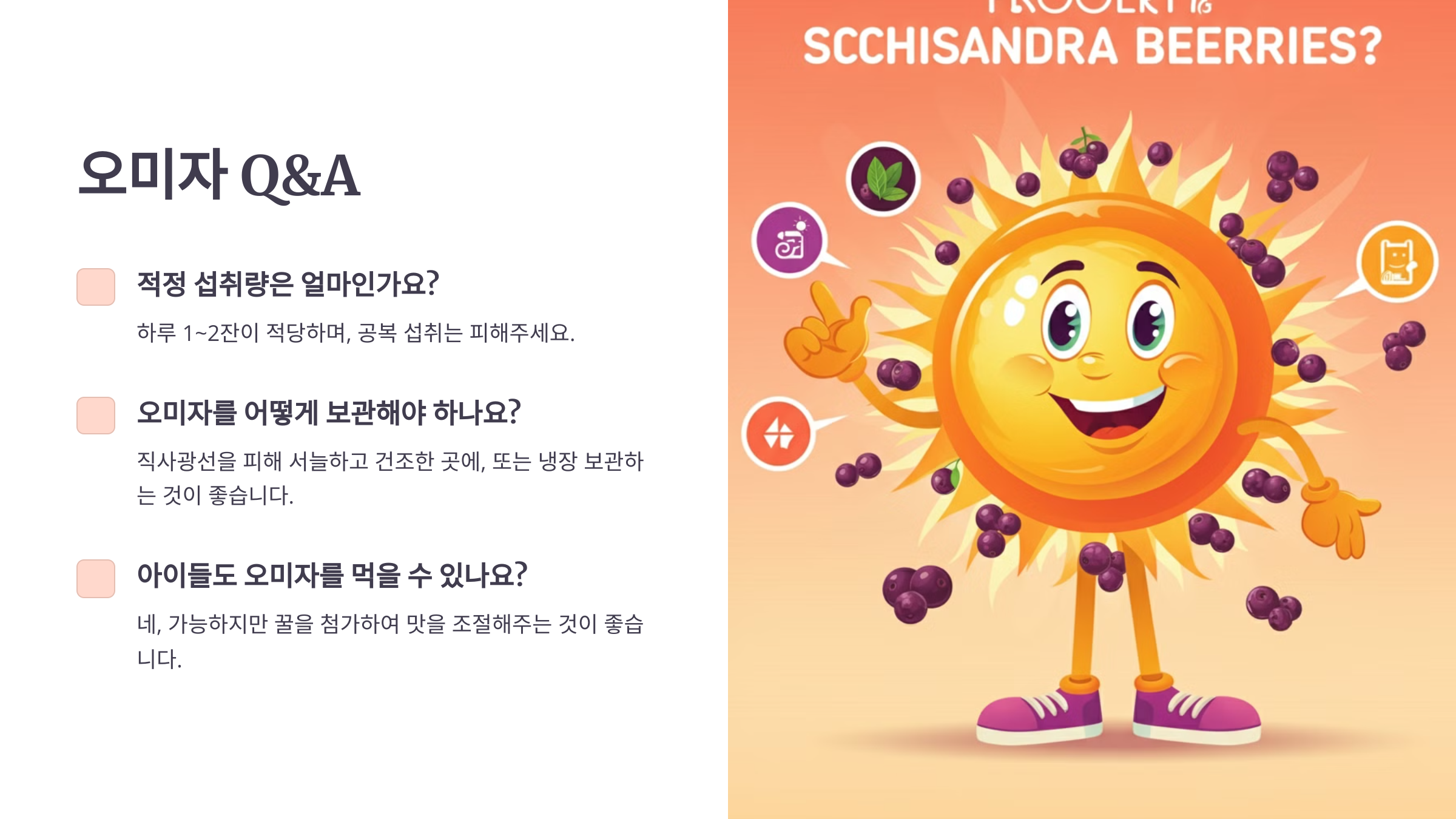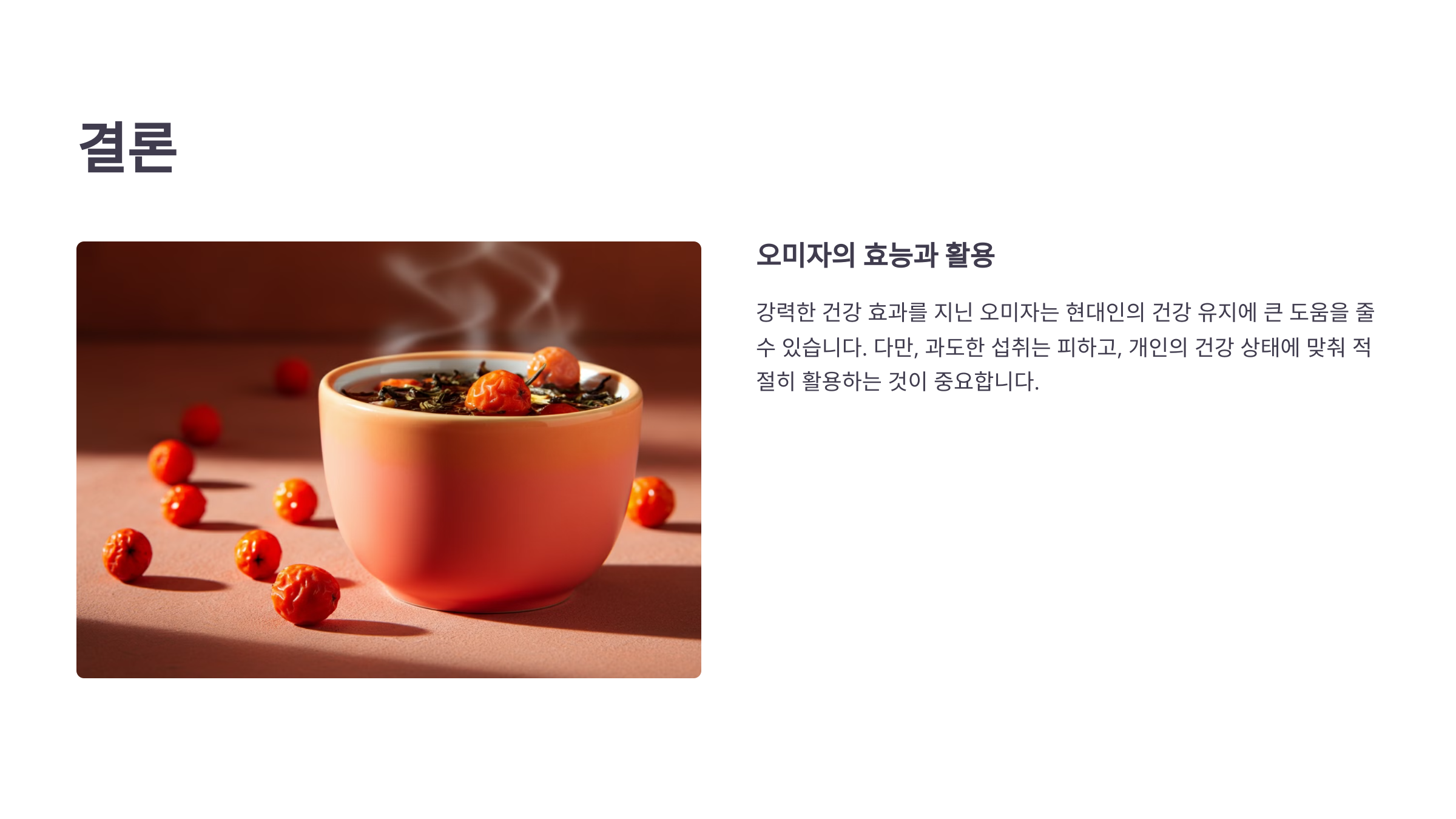 오미자는 강력한 효능을 가진 건강 식품으로, 적절히 섭취하면 현대인의 건강 유지에 큰 도움을 줍니다. 하지만 부작용 가능성을 고려해 과도한 섭취를 피하고, 자신의 상태에 맞게 적절히 활용하는 것이 중요합니다. 오미자 차와 식초를 활용한 다양한 방법으로 매일 간편하게 건강을 챙겨보세요! 😊
