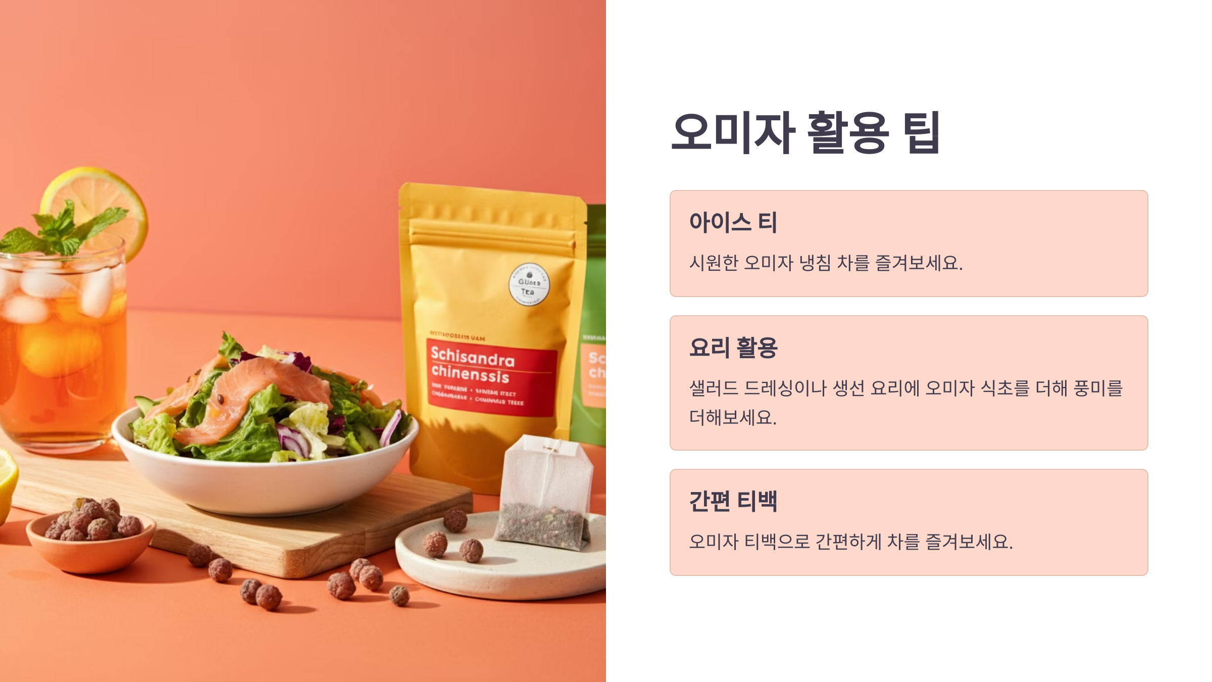 - 아이스 티로 즐기기: 여름철에는 냉침한 오미자 차를 냉장 보관 후 시원하게 마시세요.
