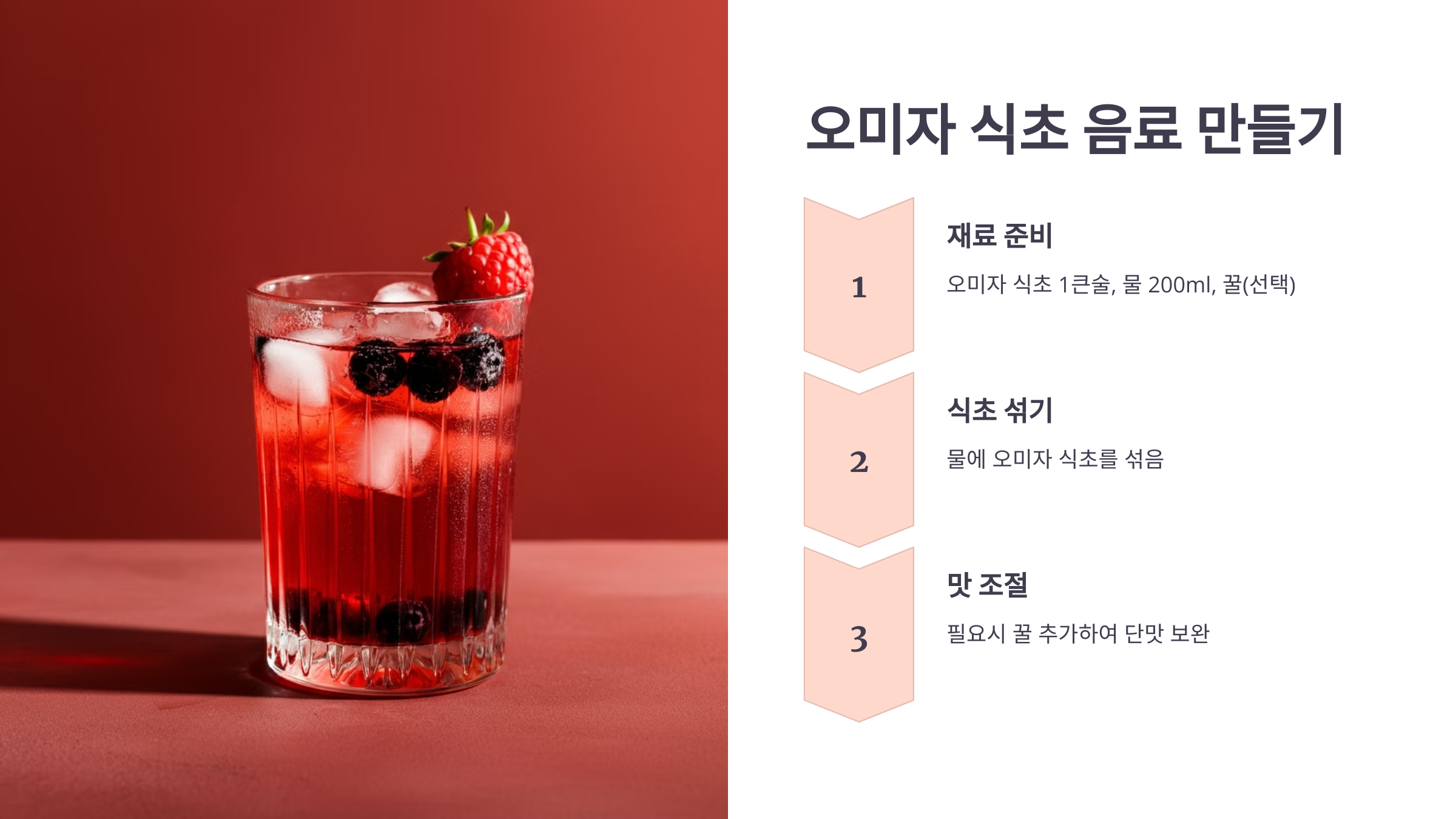 - 재료: 오미자 식초 1큰술, 물 200ml, 꿀(선택)