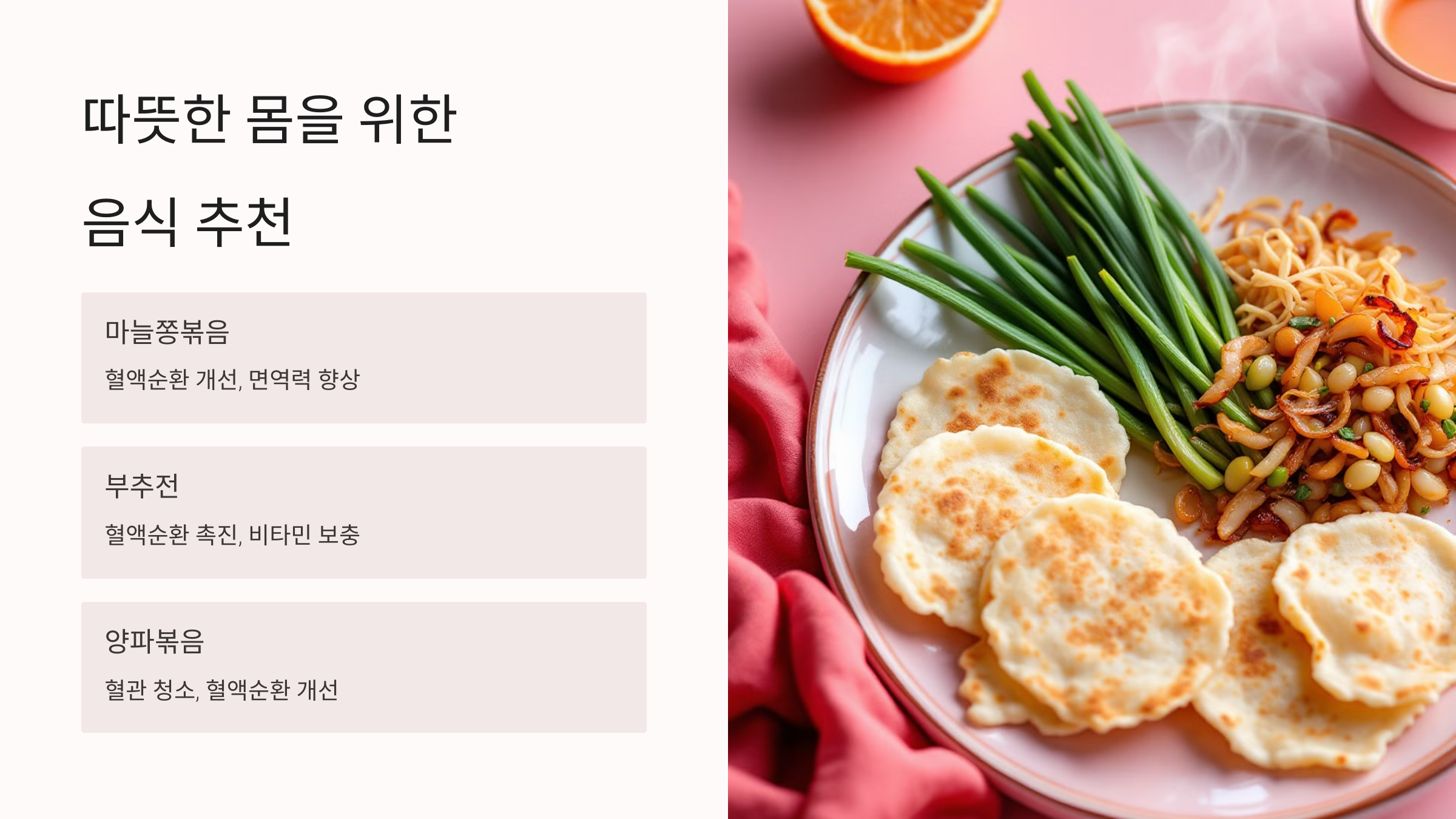 • 부추전: 부추전은 혈액순환을 촉진하고 비타민을 보충해 주는 건강한 음식입니다.