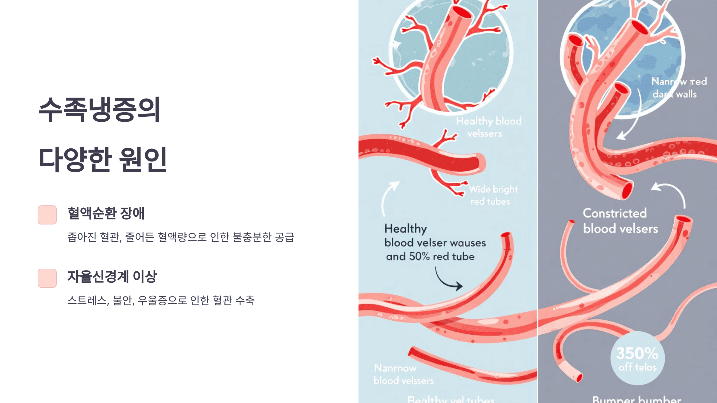 따뜻한 옷을 겹겹이 입고, 난방을 틀어도 손발은 꽁꽁 얼어붙고, 밤잠을 설치게 만드는 수족냉증. 단순히 추위를 많이 타는 체질이라고 생각하시나요? 수족냉증은 단순히 추위를 많이 타는 체질을 넘어 다양한 원인과 증상을 동반하는 질환일 수 있습니다.