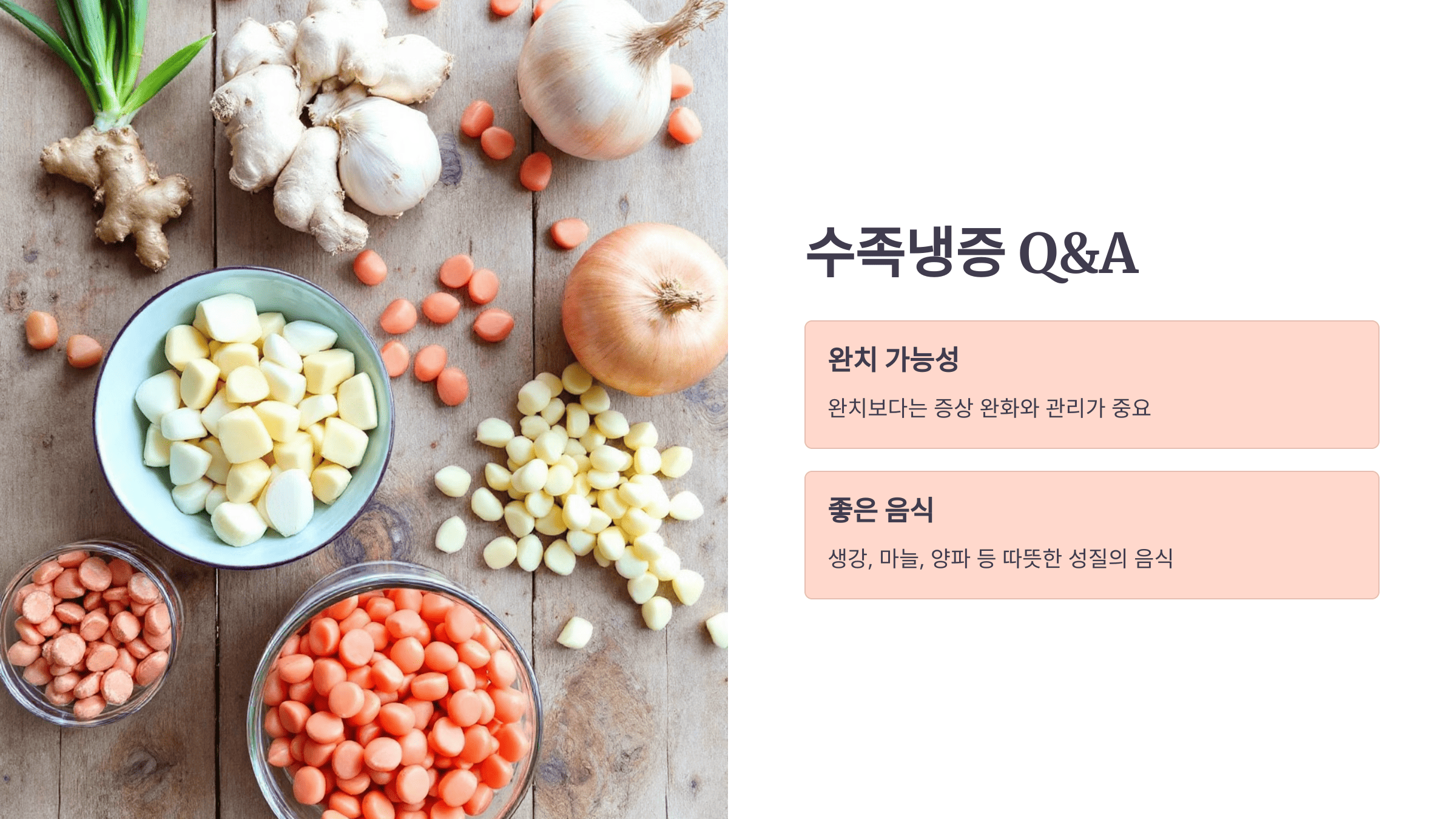 A. 수족냉증은 완치보다는 증상을 완화하고 관리하는 것이 중요합니다. 원인 질환이 있다면 이를 치료하고, 생활습관을 개선하면 증상이 많이 호전될 수 있습니다.