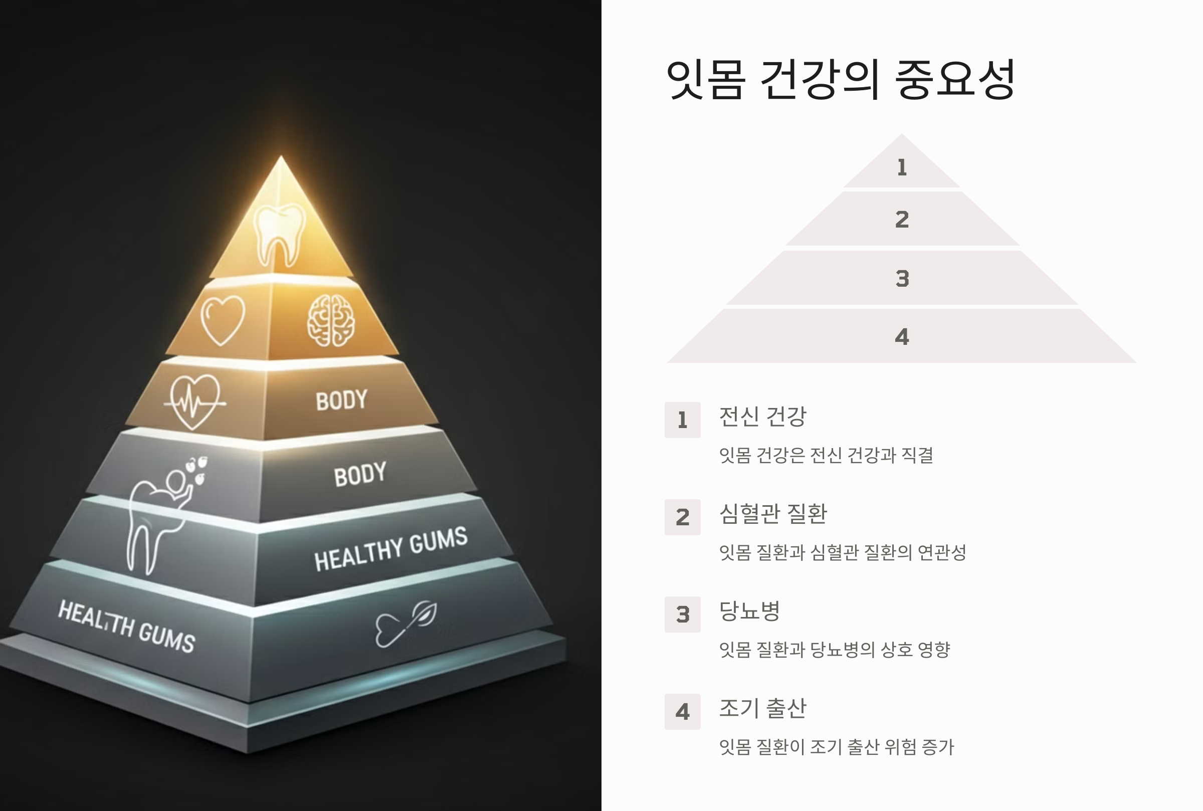 잇몸 질환은 단순히 잇몸에만 국한된 문제가 아닙니다. 치주 질환은 심혈관 질환, 당뇨병, 조기 출산 등 다양한 전신 질환과 연관이 있다는 연구 결과가 많이 발표되고 있습니다. 따라서 잇몸 건강은 전신 건강과 직결되어 있다고 할 수 있습니다.