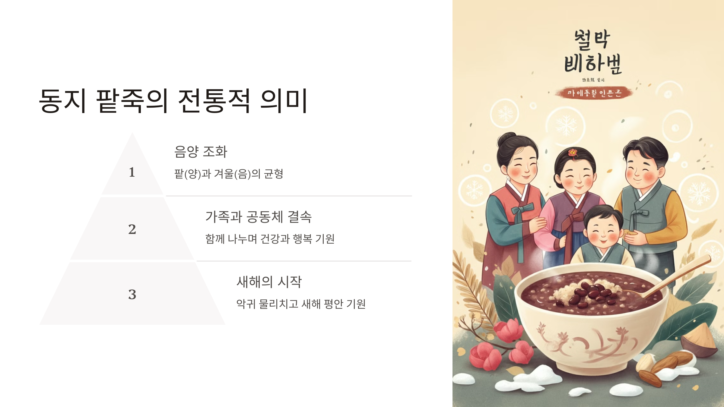 - 팥죽은 가족, 이웃과 함께 나누는 음식입니다. 함께 먹는 행위는 서로의 건강과 행복을 기원하며 공동체의 결속을 다지는 의미를 가집니다.