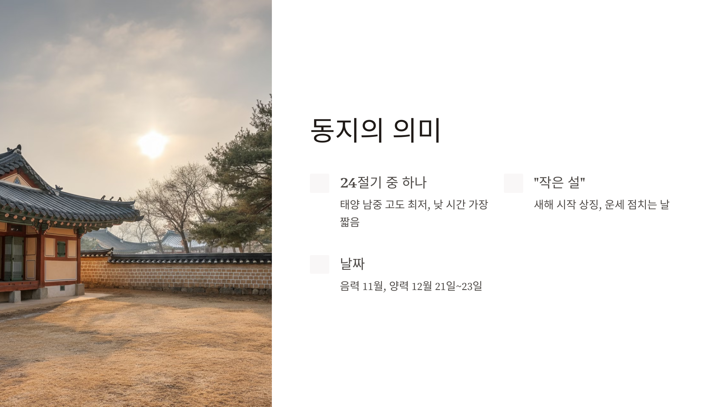 동지는 음력으로 한 해의 마지막 절기이자 새해로 향하는 관문입니다. 팥죽을 먹으며 악귀를 물리치고 새해의 평안을 기원했습니다.