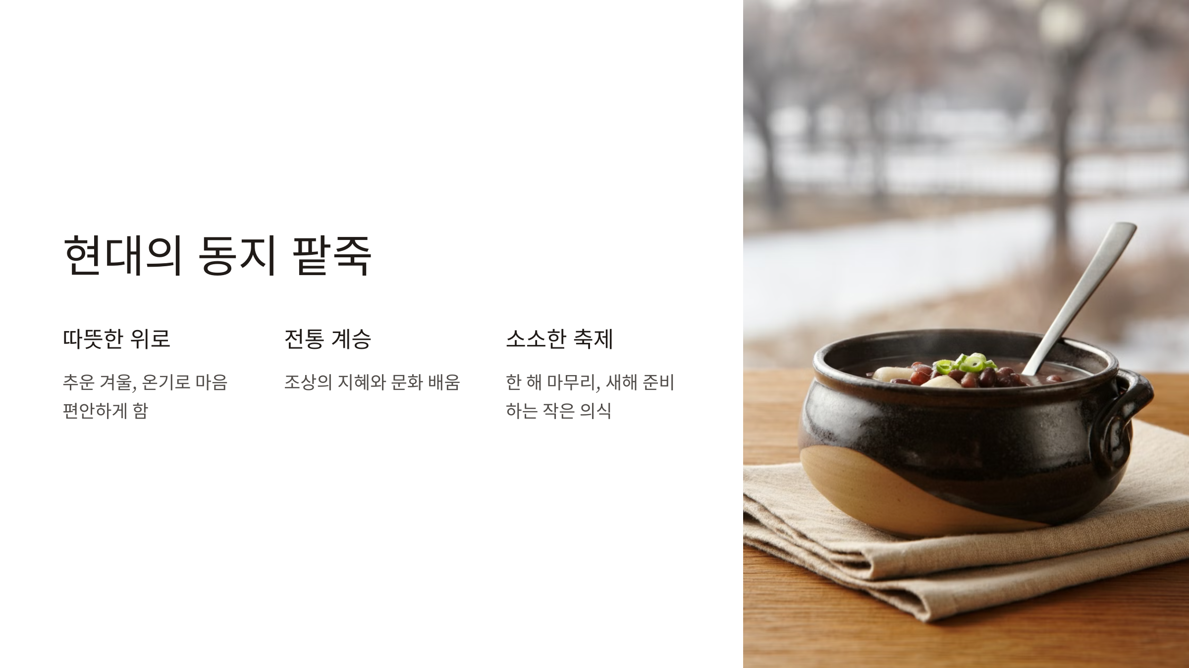 오늘날에도 많은 가정과 음식점에서 동지 팥죽을 즐기며 전통을 이어가고 있습니다. 그러나 악귀를 쫓는 의식보다는 가족과 따뜻한 음식을 나누며 겨울의 깊이를 느끼는 데 초점을 맞추고 있습니다. 동지 팥죽은 단순히 옛 풍습을 넘어 현대인들에게도 다음과 같은 의미를 제공합니다.