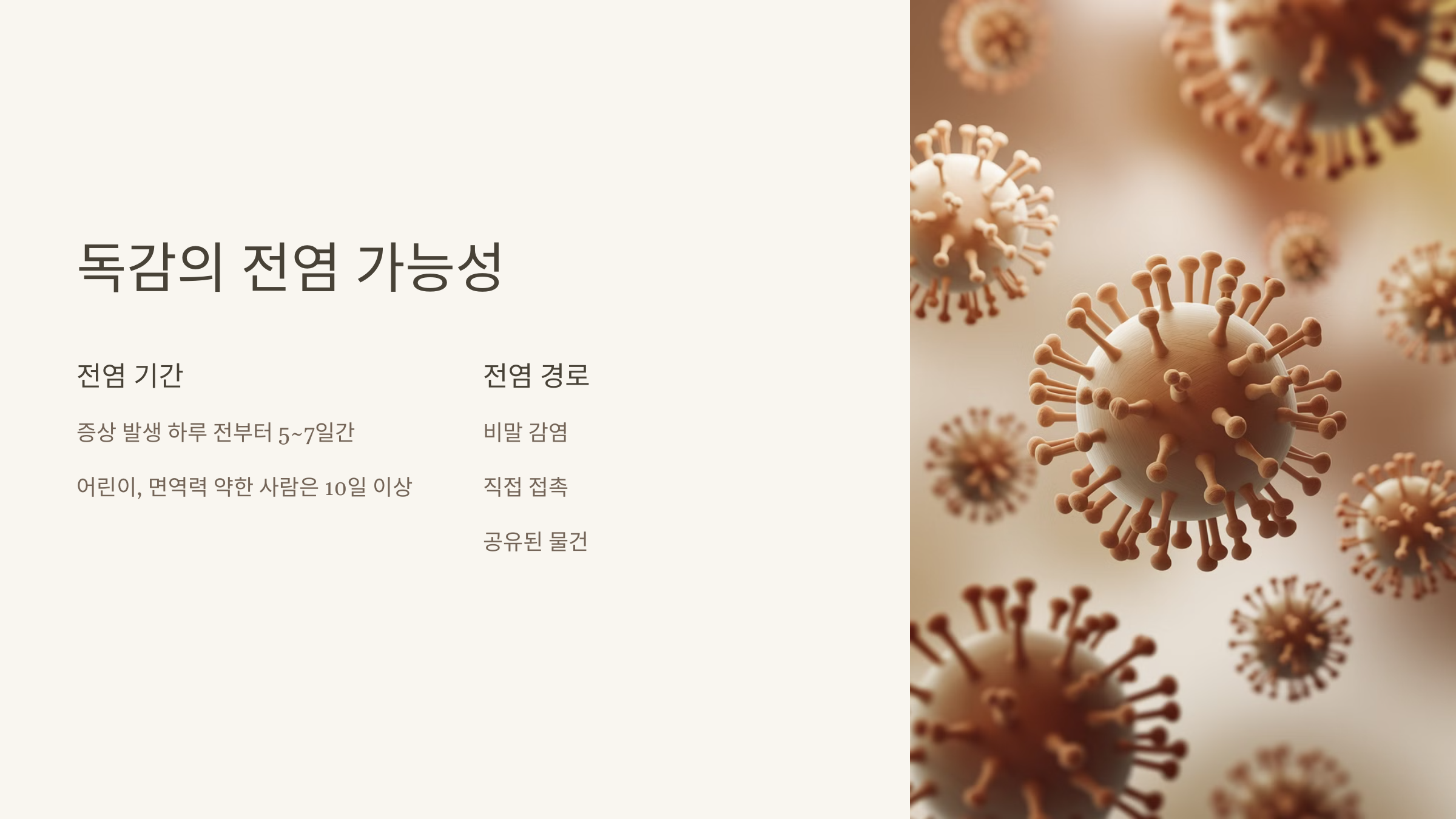 독감은 빠르게 전파될 수 있는 질병이지만, 잠복기와 전염성을 제대로 이해하고 예방 방법을 실천하면 충분히 예방할 수 있습니다. 특히 개인위생 관리독감 예방 접종은 가장 효과적인 예방 수단입니다.