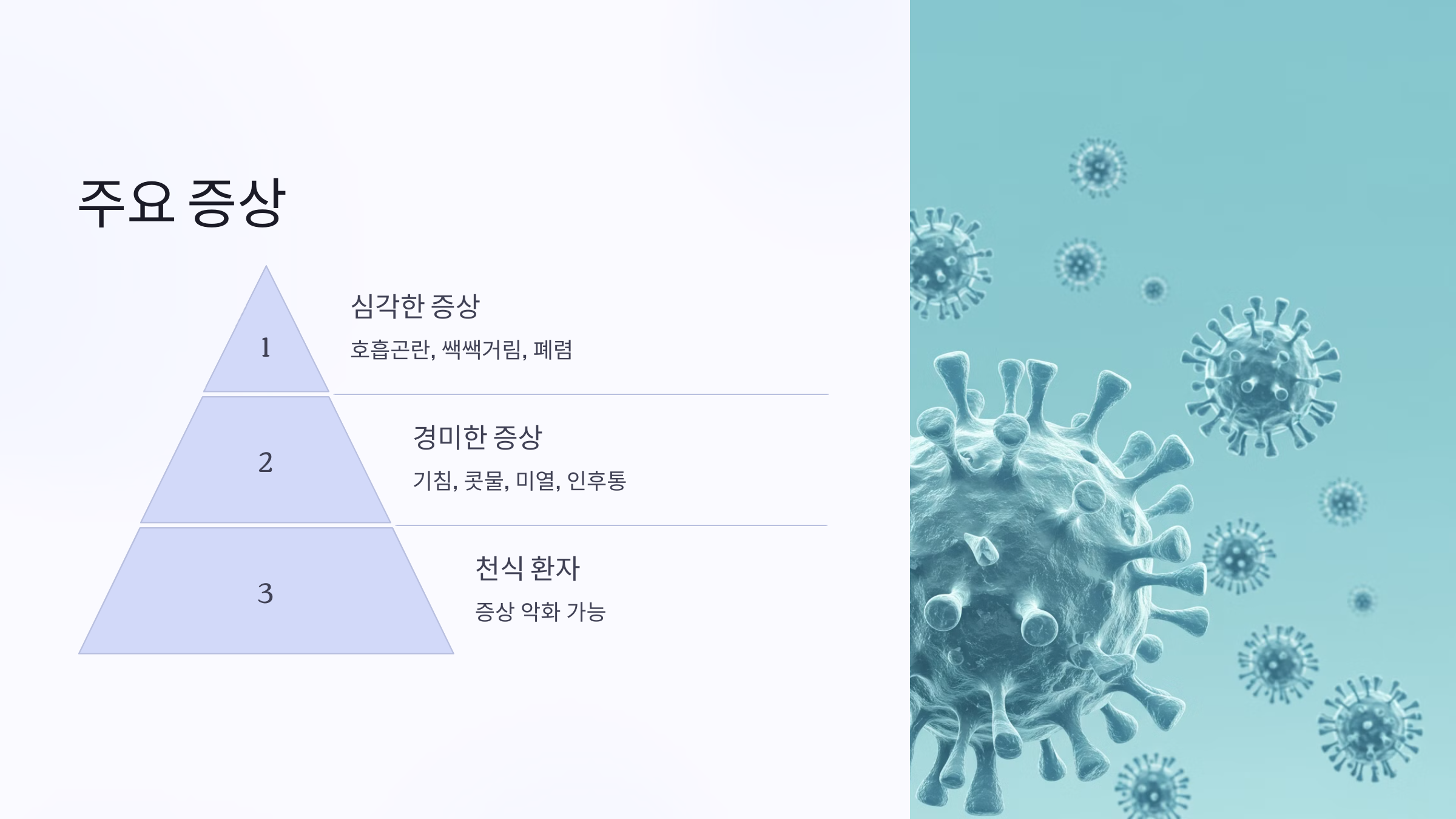 • 심각한 증상: 호흡곤란, 쌕쌕거림, 폐렴