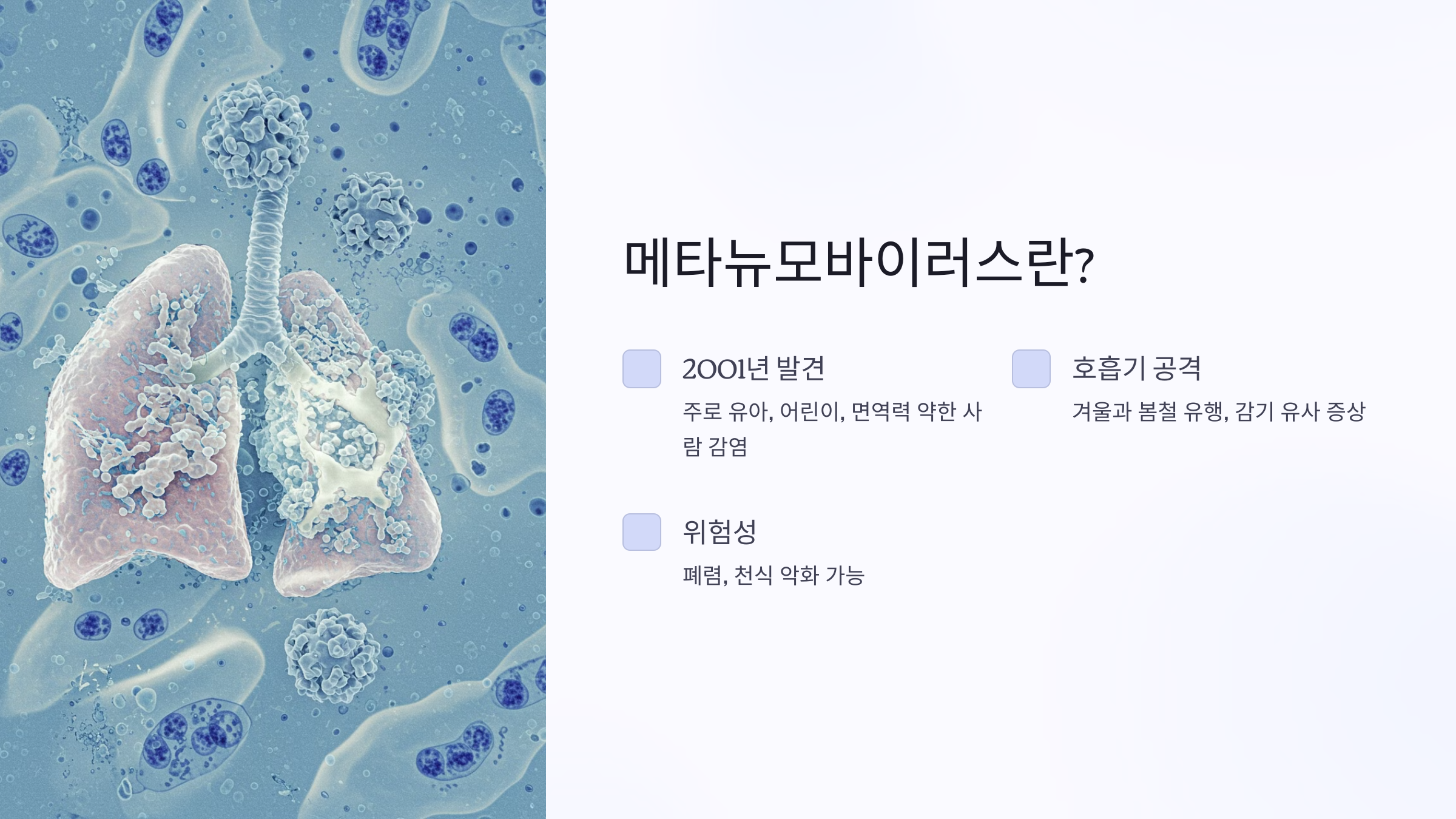 알고 계셨나요? 메타뉴모바이러스는 감기처럼 느껴지지만, 면역력이 약한 상태에서는 위험도가 높아질 수 있습니다.